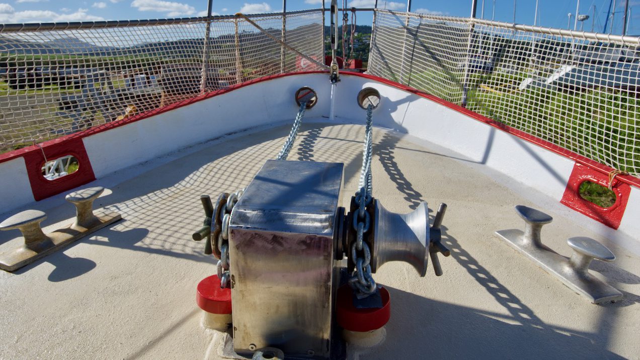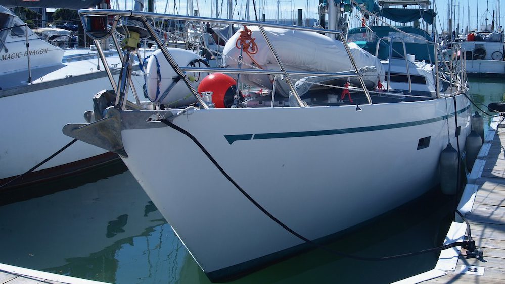Eine fähige und durchdachte Blauwasseryacht, die Ankerrolle ist mit großen „Ohren“ ausgestattet, zusätzlich könne ein Bolzen eingesetzt werden, um sicherzugehen, dass die Ankerkette auch am unruhigen Ankerplatz auf der Bugrolle bleibt.
