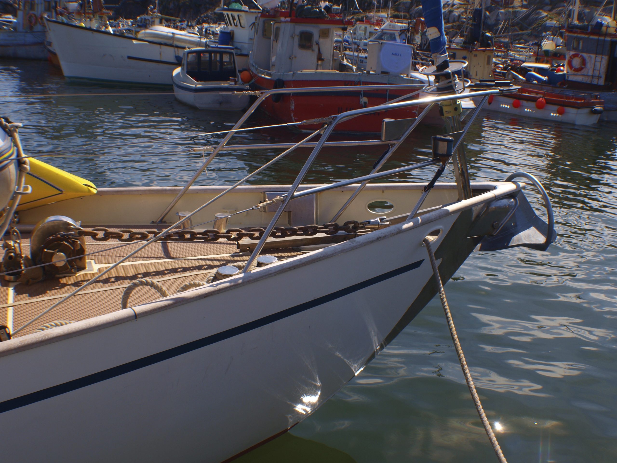 Der Erbauer unseres Bootes gab uns den guten Tipp, unseren Bugsprit seitlich gegen das Abrutschen der Crew im Seegang zu verbessern, weshalb wir ein Stück Holz als Fußreling montiert haben. Dies bewährt sich hervorragend. Um das Segel zu schonen, wenn es aufgrund einer Windzunahme geborgen wird, haben wir außerdem ein Relingsnetz montiert. Auch diese Maßnahme bewährt sich. Jedoch muss gesagt werden, dass das Relingsnetz am Bug bei Gefahr von Deckvereisung in den Hohen Breiten abgenommen werden muss, da die Gischt im Netz sofort gefriert und ein gefährlicher Eispanzer entsteht.
