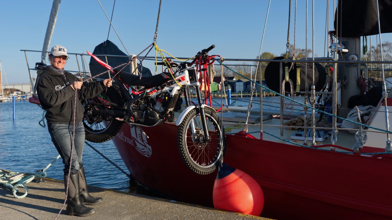Das kleine Trial Motorrad lässt sich mit unserem Genua-Fall problemlos auf Deck heben und passt mit demontierter Gabel durch die vordere Luke (60x60cm groß) in die Bugkabine.